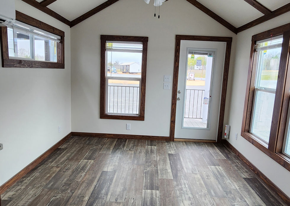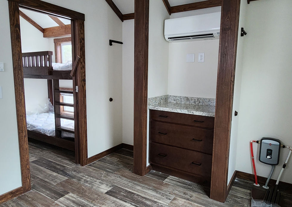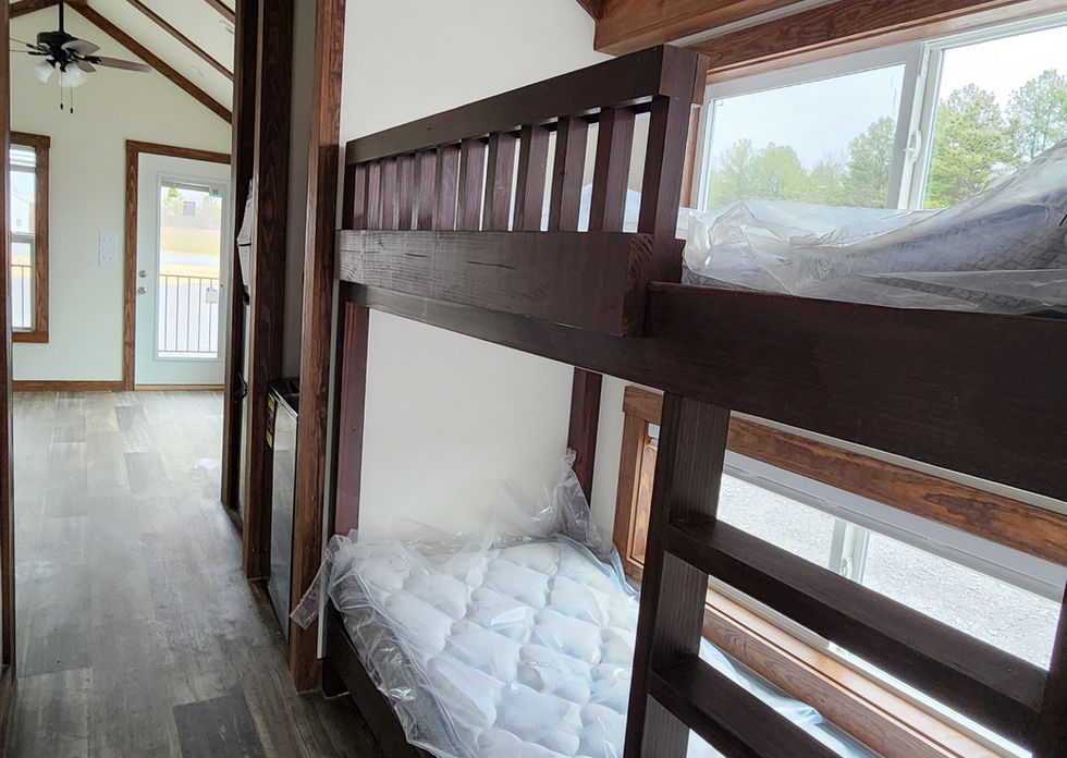 The Cypress built by Clayton, is a 399 sq. ft. one bedroom, one bath with bunk beds off the hall for additional sleeping. It comes with all the necessary appliances which include a fridge, stove, microwave and a washer/dryer. It also has two mini split units for heat and air and a covered porch. This home has a tankless water heater and requires 100 amp service.
